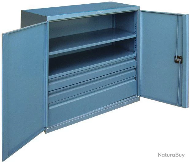 Armoires à outils avec 2 portes et serrure. Base1000 x 490mm, hauteur1000mm. Exécution très stable et lourde prévue pour un usage intensif et industriel. Choix entre plusieursaménagements intérieurs: étagères réglables en hauteur par 25mm, capacité 200kg Tiroirs amovibles, capacité 50kg Avec bacs de rangement de différentes tailles Construction en acier 10/10mm recouvert de laque martelée bleur. Autres couleurs, clés supplémentaires et passe-partout disponibles sur demande.