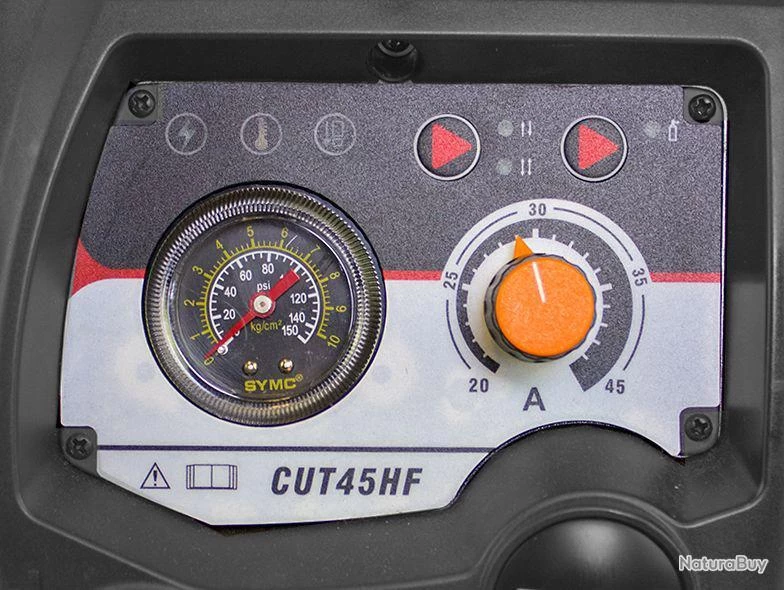 Découpeur plasma portable 45A. Caractéristiques : Coupe facilement à travers uneépaisseur de tôle de 12 mm. épaisseur de coupe maximale 19 mm Démarrage haute fréquence (HF) Pour la découpe de tous les métaux conducteurs tels que l’acier, l’aluminium, le cuivre, l’inox, . . . Très léger Idéal pour les endroits difficiles d’accès Cycle de travail élevé : 35% à 45 A Bouton de sélection 2 temps/4 temps pour découpe de longue durée Post flow automatique pour le refroidissement de la tête de coupe Régulateur de pression d’air intégré automatique avec écran Conforme CE et CEM Protection IP23 permettant une utilisation sur chantier Protection contre la surtension et la sous-tension sur le réseau Livré avec : Torche plasma Trafimet avec raccord rapide à l’avant de l’appareil Tuyau de gaz de 1 mètre en caoutchouc renforcé avec raccord rapide à l’arrière de l’appareil Pince de masse avec 3 mètres de câble et raccord DX25 sur l’appareil