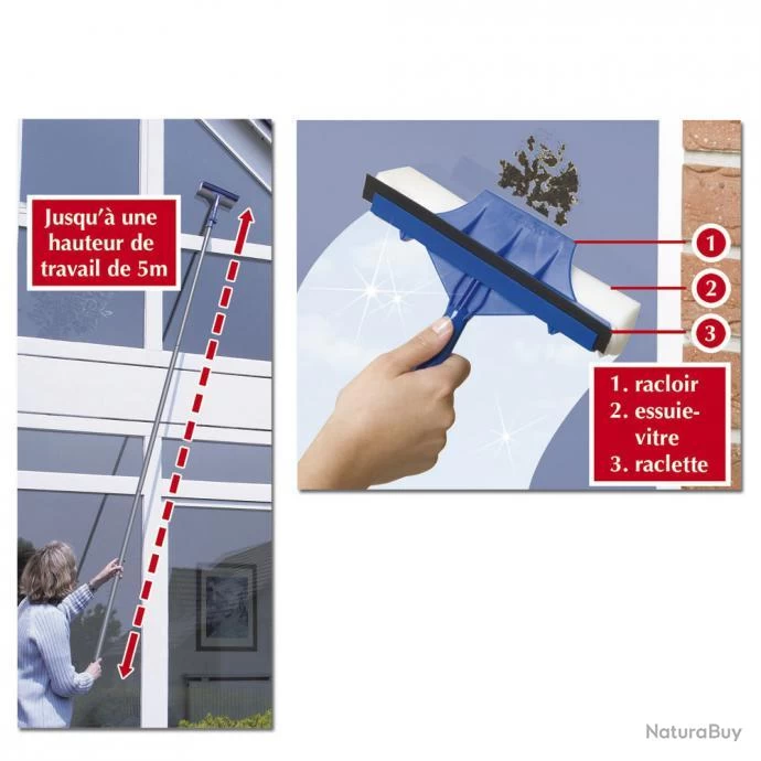 Grâce à lessuie-vitres maxi, nettoyez sans problèmes les fenêtres placées à grande hauteur jusquà 5m. Sa tête individuellement réglable vous permet daccéder à tous les recoins en un tour de main.