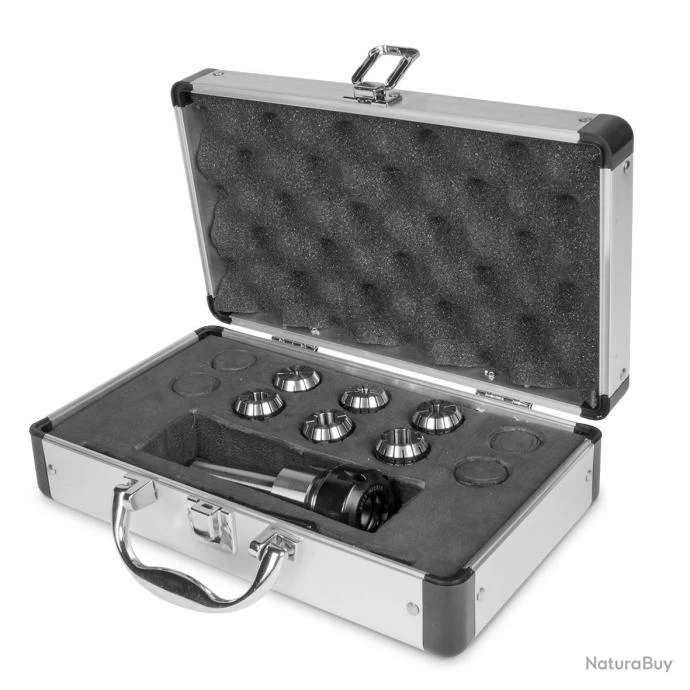 Coffrets de mandrins à pinces ER avec pinces de serrage DIN6499 et clé à crochet. Avantages : Divers raccords de porte-pince possibles : CM2/M10, CM3/M12, et CM4/M16 Le choix est également possible entre plusieurs types de pinces de serrage ER : ER25, ER32 et ER40 Livrés de série avec : 1 porte-pince ER 1 clé à crochet Plusieurs pinces de serrage ER DIN6499 Boîte de rangement verrouillable en aluminium avec incrustations
