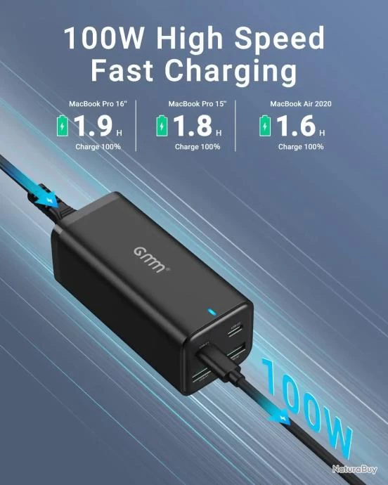 - ?[Multiple Chargeur USB C 4 En 1] Dites au revoir aux anciennes brique chargeur; GMM Chargeur 100W utilise la technologie GaN III, ce qui rend notre chargeur MacBook non seulement plus petit et plus léger, mais aussi plus rapide à charger, idéal pour votre PC portable USB-C ou tablette.