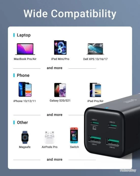 - ?[Compatibilité Universelle] Charger secteur USB C 100W est compatible avec MacBook Pro/Air, HP Spectre, iPad Pro, iPhone 13 Pro/12 Pro/12Pro Max /11 Pro Max, Dell XPS 13, AirPods Pro, Samsung Galaxy S22 /S21, Galaxy Tab S4/S5E, iWatch Series 7/6/5/4/3, Haut-parleur et écouteurs TWS, etc.
