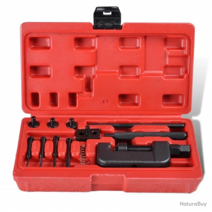 Outil universel de rivet Cet outils de fendeur de chaîne permet un fendage et un assemblage de chaîne faciles et rapides. Il est suffisamment polyvalent pour être utilisé sur des chaînes à cames ou des chaînes d’entraînement. Tous les outils sont fabriqués à partir d’un corps en acier forgé résistant de haute qualité, qui est en finition noire. Cette trousse d’outils de rivetage pour brise-chaîne cassera les chaînes de # 35 à # 630. Vous pouvez également travailler sur la chaîne # 520 et plus avec la tête de rivet affûtée. Il comprend 3 broches de différentes tailles pour s’adapter à la plupart des chaînes (2 mm, 3 mm, 4 mm). Matériau : AcierChaînes de frein : # 35-630 # 415 # 420 # 428 # 520 # 525 # 530/50 # 630Tailles de trois broches : 2 mm, 3 mm, 4 mmLa livraison comprend:1 x pic diviseur P2 – 2,2 mm1 x séparation de pic P3 – 2,9 mm1 x séparation de pic P4 – 3,8 mmRT = 1 x pointe de rivet1 x corps d’outil1 x boulon d’alignement1 x piston1 x poignée1 x goupille de levier de pression1 x ressort2 x enclume (petite et grande) 1 x guide de pointe de séparation supérieure pour pointe de 2,2 mm1 x pointe de guidage de séparation inférieure pour pointe de 2,2 mm1 x boîte de rangement 210144