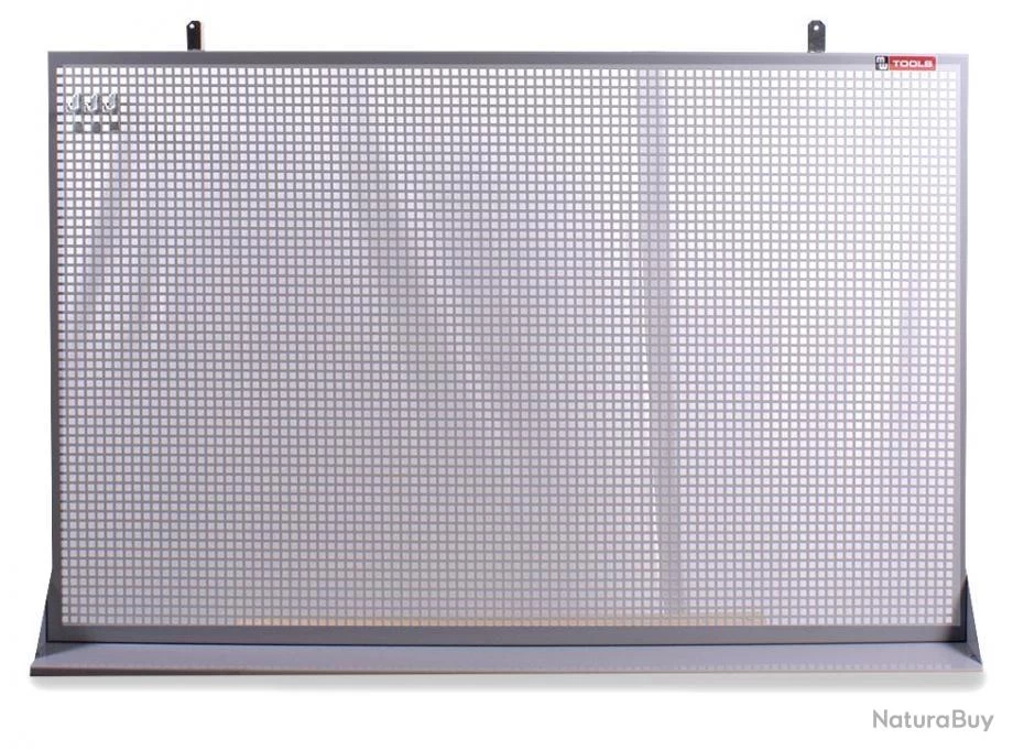 Panneau perforé plat en métal pour montage mural. Perforations carrées de 10×10 mm et distance de centre à centre de 15 mm. Fourni avec plaque de support pour divers outils. Disponibles en option : crochets, sets de crochets, rail magnétique.