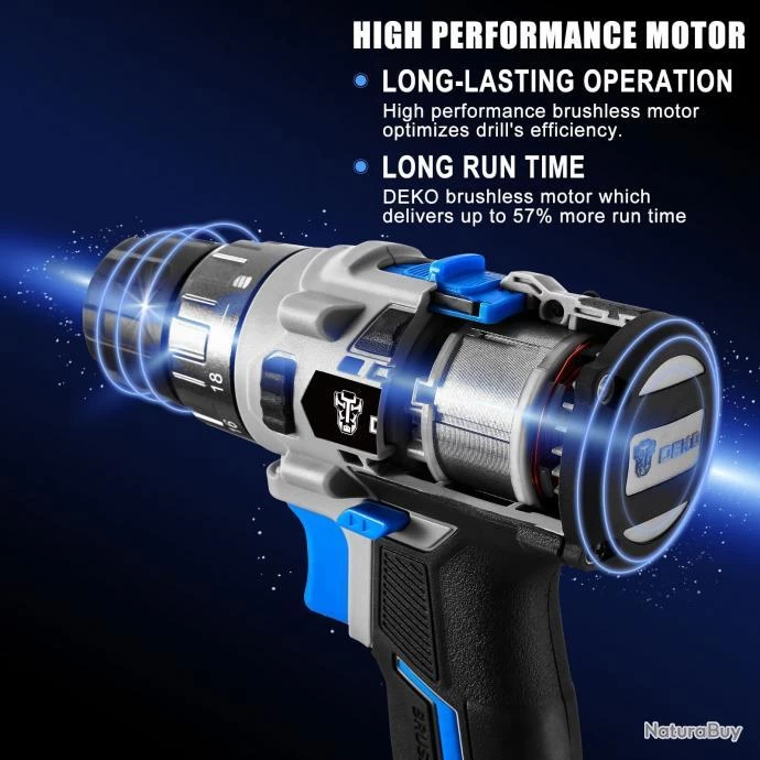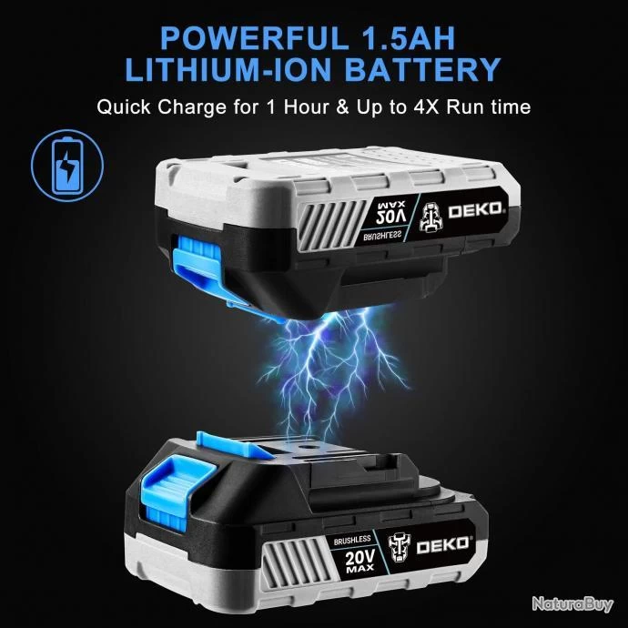La perceuse sans fil DEKO 20V MAX 3/8 avec couple max 42N.m combine une plage de vitesse double et un embrayage 18 + 1 positions dans une taille compacte qui offre un contrôle précis pour percer dans le bois, le métal, le plastique et toutes les tâches de vissage.