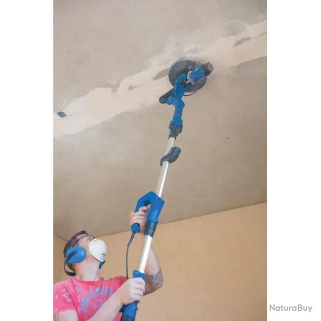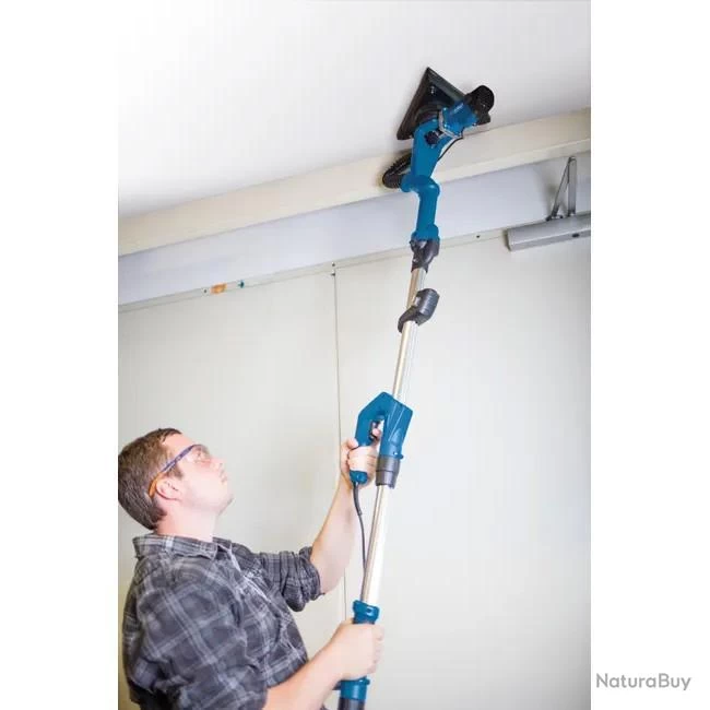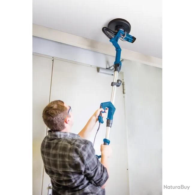La ponceuse DS930 Scheppach permet de poncer les murs et les plafonds. Grâce à l’orientation de sa tête de 0° à 90°, le ponçage des plafonds peut être réalisé directement depuis le sol et la tête triangulaire permet de réaliser le ponçage des angles et des coins sans peine. Système de tête interchangeable : tête circulaire ou triangulaire La vitesse est variable pour optimiser le ponçage sur des surfaces différentes La grande surface de ponçage de Ø 215 mm ou de 282 x 282 x 282 mm couvre de larges zones en une seule passe. Les disques de ponçage se laissent facilement mettre en place grâce à leur revêtement auto-agrippant Moteur puissant de 710 W Grâce à son bras télescopique les coins qui sont difficiles à atteindre peuvent être facilement poncés Le design ergonomique de la machine permet une préhension évitant un excès de fatigue pendant le travail Facilite le ponçage des plafonds et l’élimination des restes de papier peint, de peinture, d’enduit fragilisé etc. De nombreux accessoires sont fournis avec la machine : 1 éclairage par LED, 12 mm de tuyau avec 2 adaptateurs d’aspiration, 1 sac de transport, 12 disques et triangles de ponçage